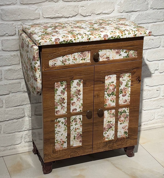 خرید آنلاین میز چرخ خیاطی و اتو وکیوم قهوه ای کد931 باکیفیت عالی و قیمت مناسب و ارسال فوری به سراسر ایران ارتفاع حدود ۷۵ سانتیمتر، طول ۶۰ سانتیمتر و عرض ۳۰ سانتیمتر در حالت جمع شده دارای صفحه اتو تاشو، کشو برای نگهداری لوازم و کمد با درب برای فضای ذخیرهسازی بیشتر است دارای طرح گلدار روی صفحه اتو و پنلهای درب و کشو می باشد جنس ام دی آف با روکش وکیوم