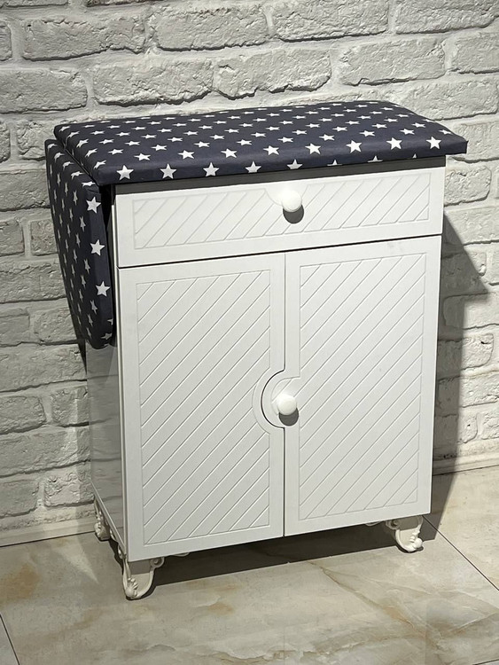 دارای یک کشو در بالا و دو درب کمدی در پایین است که فضای مناسبی برای نگهداری لوازم اتو، لباسها یا سایر وسایل فراهم میکند.