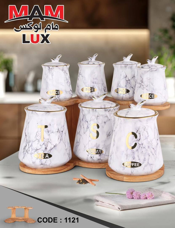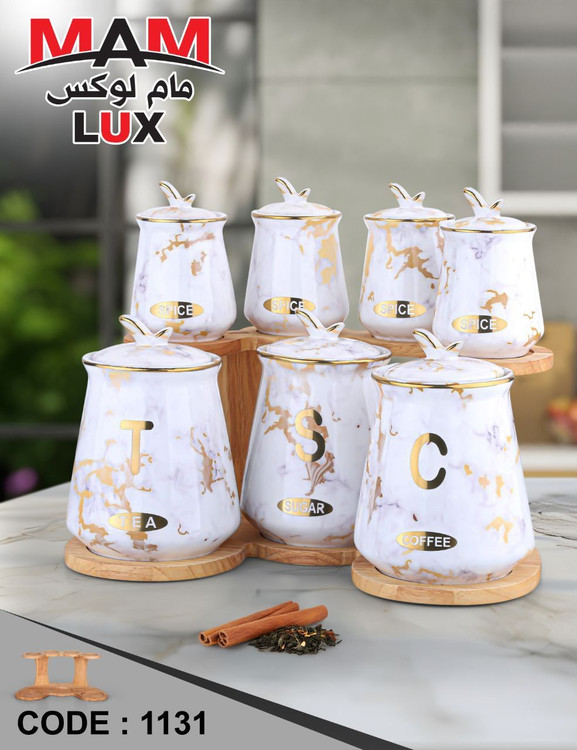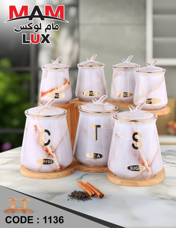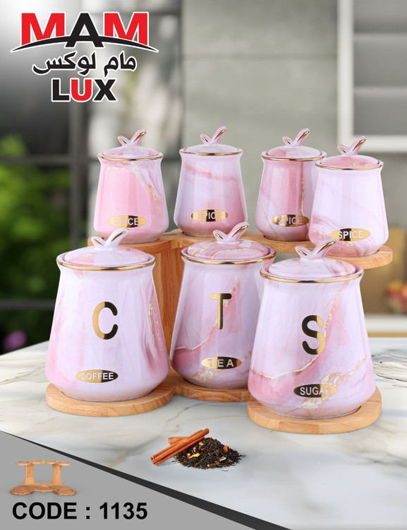 خرید اینترنتی سرویس ادویه و پاسماوری 7 پارچه نام لوکس با کیفیت بالا و قیمت دست اول و ارزان شامل سه عدد بانکه بزرگ (معمولاً برای چای، قند و شکر) و چهار عدد بانکه کوچک (برای ادویهجات) به همراه یک استند دو طبقه است با ارسال فوری به سراسر ایران